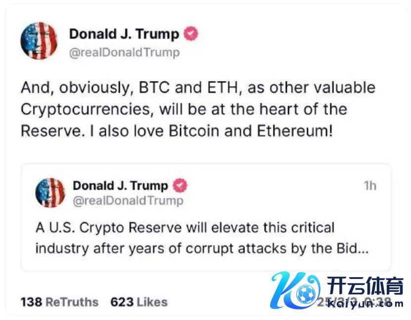 随后,特朗普又发布了一条讯息:“显着,比特币(BTC)和以太坊(ETH)手脚其他有价值的加密货币,将成为储备的中枢。”